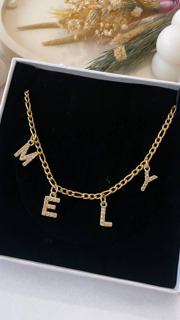 Die Länge der Halskette beträgt 40 cm und kann um 5 cm verlängert werden . Die Buchstaben sind 1 cm groß und mit Zirkonsteinen besetzt.