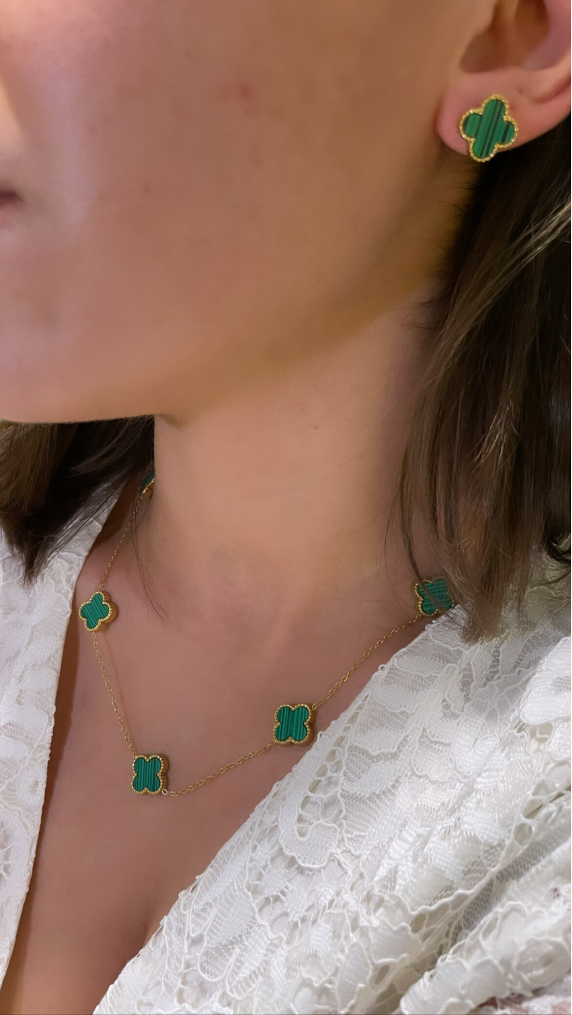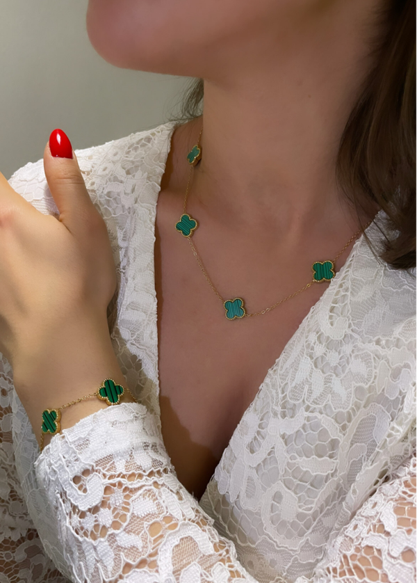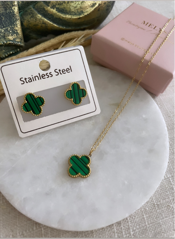 Das Set besteht aus einer Halskette, einem Paar Ohrringen und einem Armband.